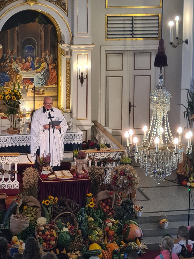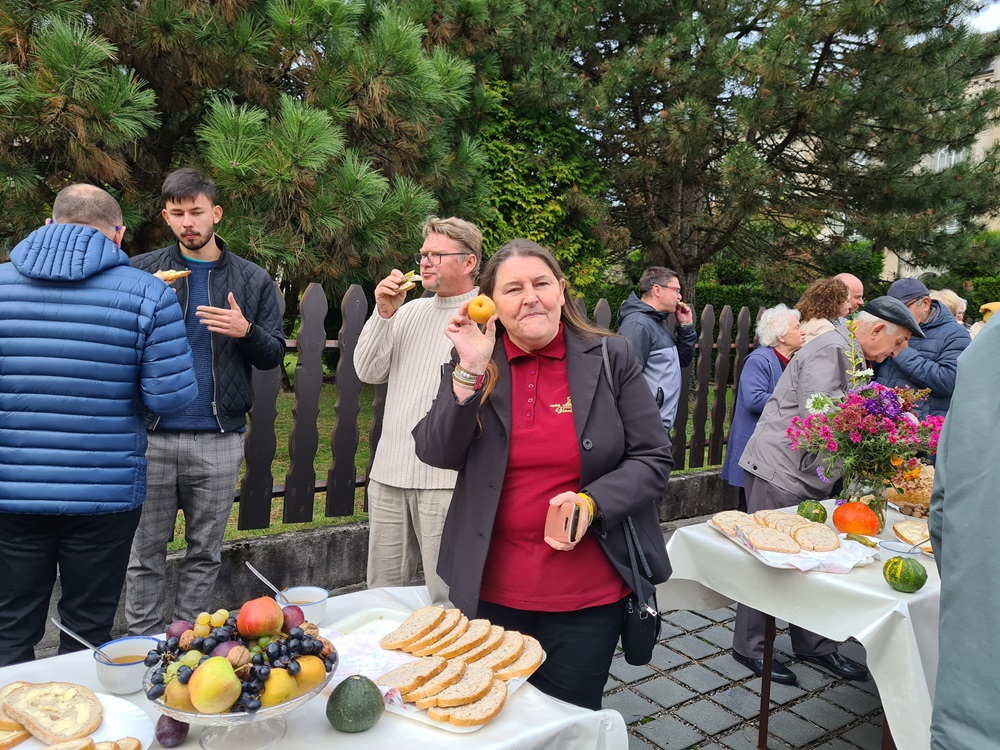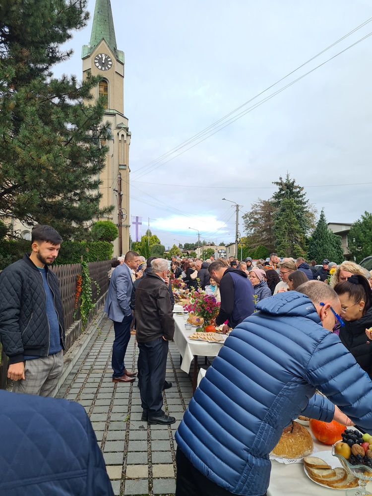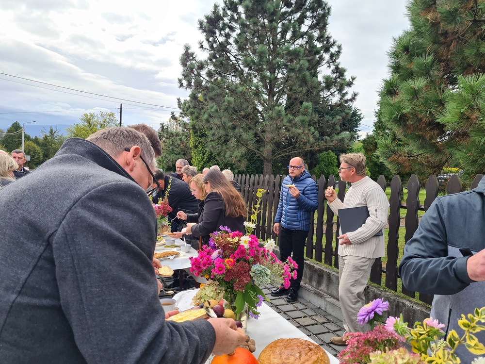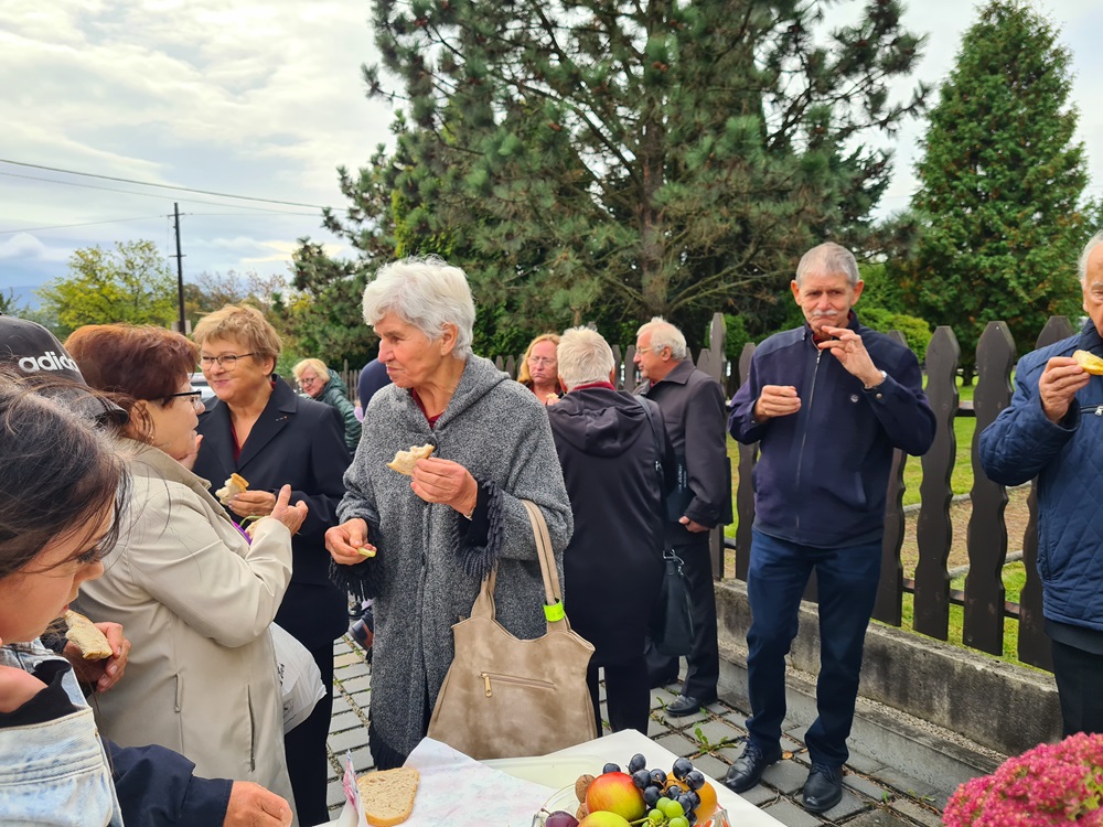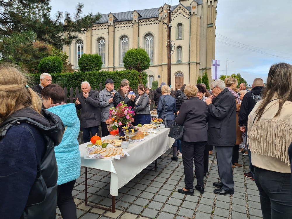 Po nabożeństwie wszyscy uczestnicy nabożeństwa zostali zaproszeni na tradycyjny poczęstunek przygotowany rękami chórzystów przy współpracy z Radą Parafialną. Na stołach pojawił się świeżo wypieczony chleb podany z masłem, miodem oraz smalcem — proste, lecz wyjątkowo wymowne dary, które od lat towarzyszą naszym żniwnym obchodom. Wśród przygotowanych potraw znalazły się także owoce i orzechy, dopełniając bogactwo jesiennych smaków.