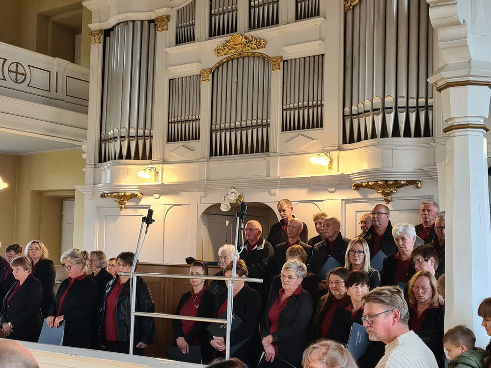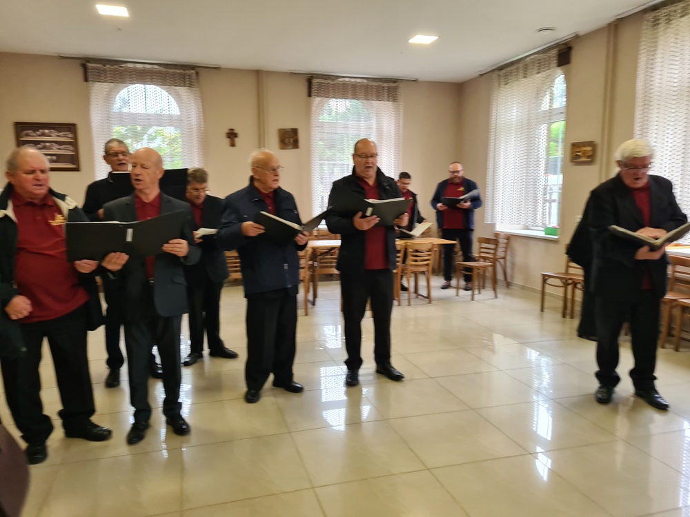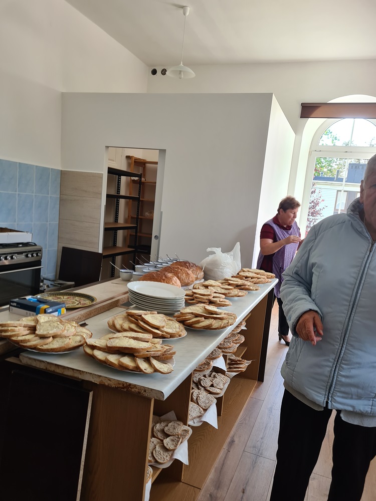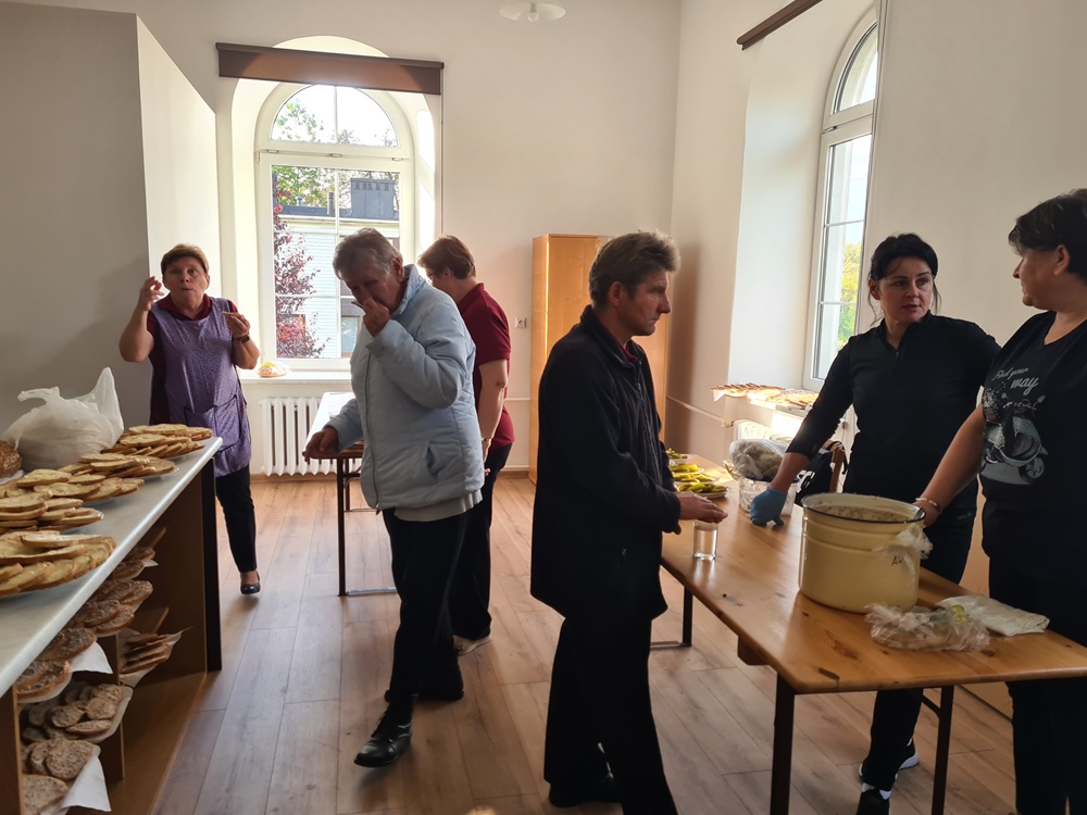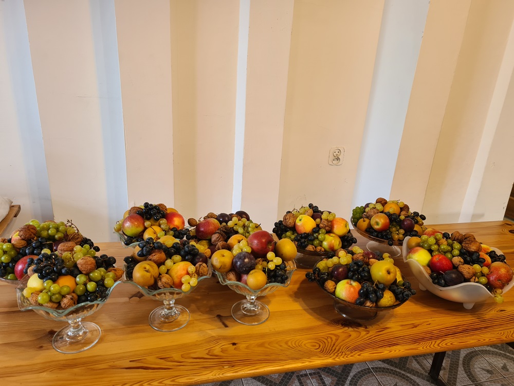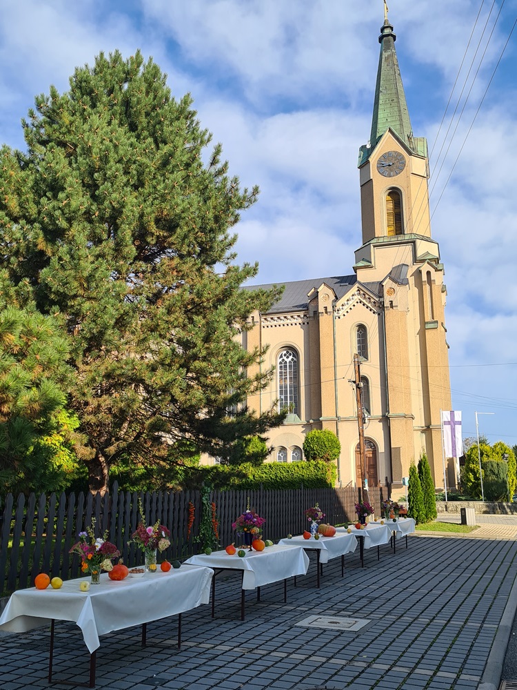 Po nabożeństwie wszyscy uczestnicy nabożeństwa zostali zaproszeni na tradycyjny poczęstunek przygotowany rękami chórzystów przy współpracy z Radą Parafialną. Na stołach pojawił się świeżo wypieczony chleb podany z masłem, miodem oraz smalcem — proste, lecz wyjątkowo wymowne dary, które od lat towarzyszą naszym żniwnym obchodom. Wśród przygotowanych potraw znalazły się także owoce i orzechy, dopełniając bogactwo jesiennych smaków.