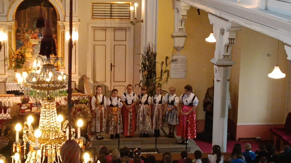 W niedzielę, 5 października, w atmosferze dziękczynienia nasza parafia obchodziła doroczne Święto Żniw. Już od samego wejścia do świątyni można było poczuć podniosły nastrój — ołtarz został pięknie ustrojony darami ziemi: świeżymi warzywami, owocami, kłosami zbóż oraz symbolicznymi wieńcami, które przypominały o całorocznej pracy rolników i hojności natury. Uroczystość ta, zgromadziła licznie parafian, którzy pragnęli wspólnie wyrazić wdzięczność Bogu za otrzymane plony oraz za codzienną opiekę nad naszymi rodzinami i gospodarstwami. Uroczystość rozpoczęła się wejściem duchowieństwa i dzieci ubranych w regionalne stroje. Z wielką powagą i skupieniem wniosły one chleb oraz Biblię, symbolizujące zarówno trud ludzkich rąk, jak i duchowy pokarm, który prowadzi nas przez życie. Ten symboliczny gest, wyrażony przez najmłodszych, przypomniał wszystkim, że wdzięczność i wiara są wartościami przekazywanymi z pokolenia na pokolenie.