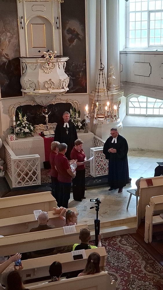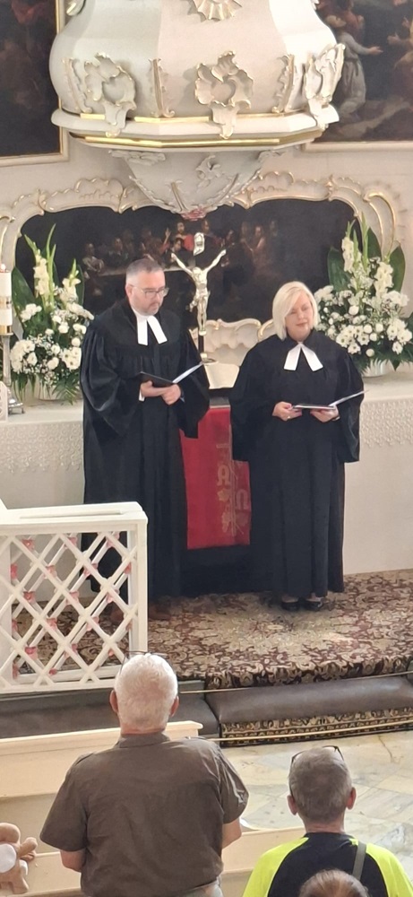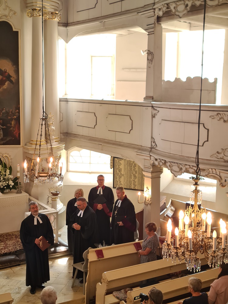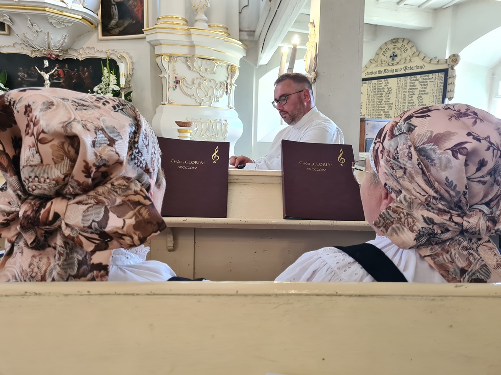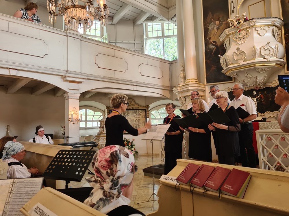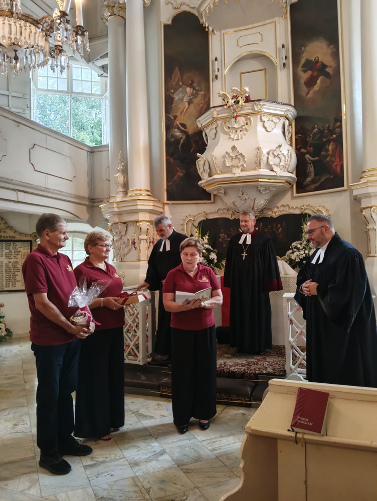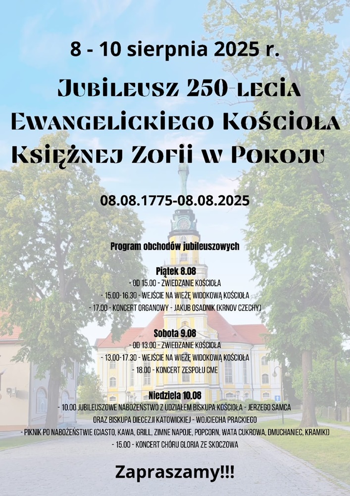 10 sierpnia 2025 roku uczestniczyliśmy w obchodach 250-lecia poświęcenia Kościoła Księżnej Zofii w Pokoju. Nabożeństwo rozpoczęło się bogatą oprawą muzyczną, w której wzięły udział zaproszone chóry „Gloria” ze Skoczowa, goście muzyczni z Rynu oraz rodzimi muzycy, przygotowując wyjątkowy program pieśni religijnych. Kazanie wygłosił biskup Kościoła, ks. Jerzy Samiec, opierając swoje rozważania na słowach Psalmu 23. Podkreślił w nim Boże prowadzenie, troskę i wierność, które – jak wskazał – towarzyszyły wspólnocie przez wszystkie lata jej istnienia. Podczas uroczystości przekazano również pozdrowienia i okolicznościowe prezenty dla parafii–Jubilatki od zaprzyjaźnionych parafii i gości.